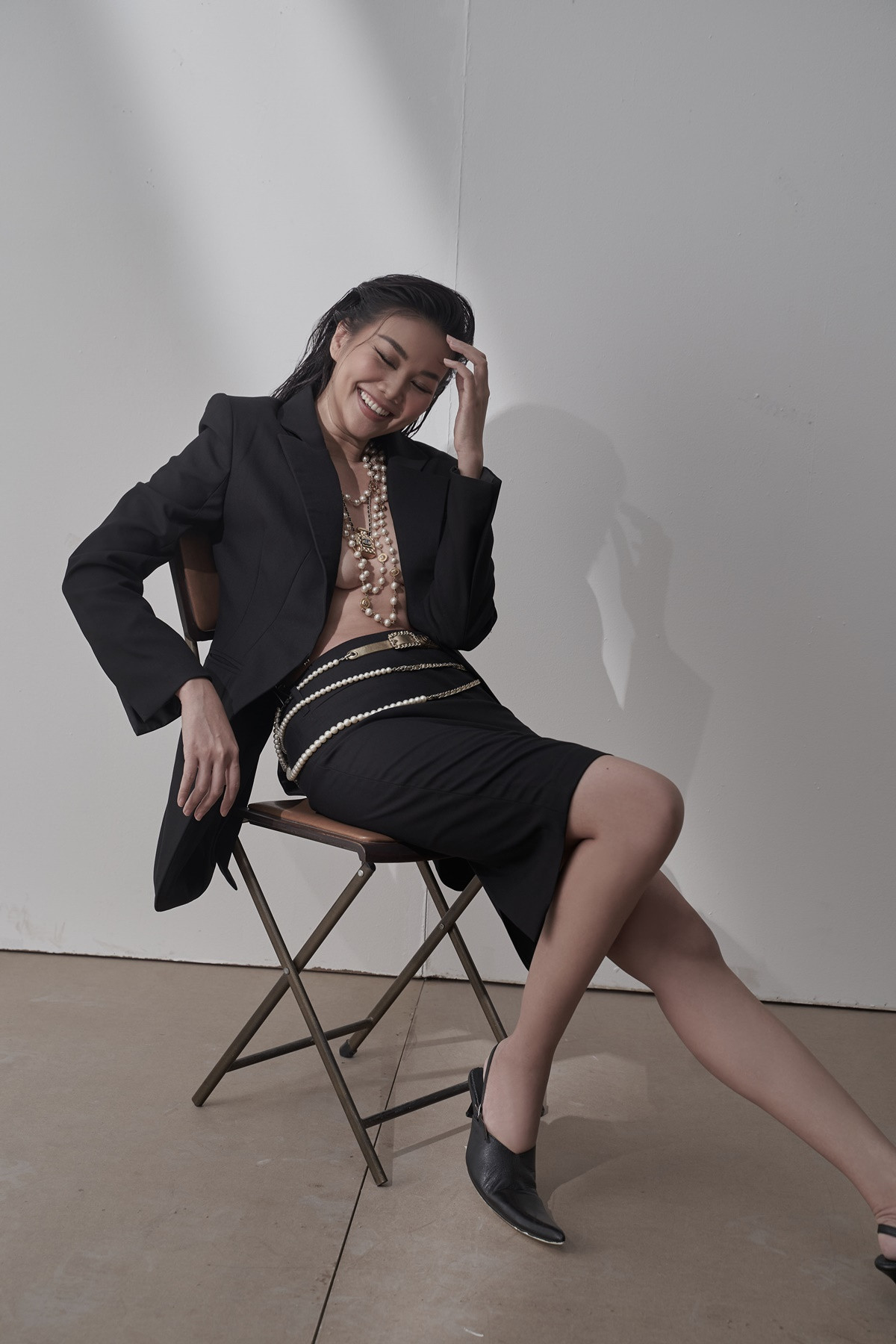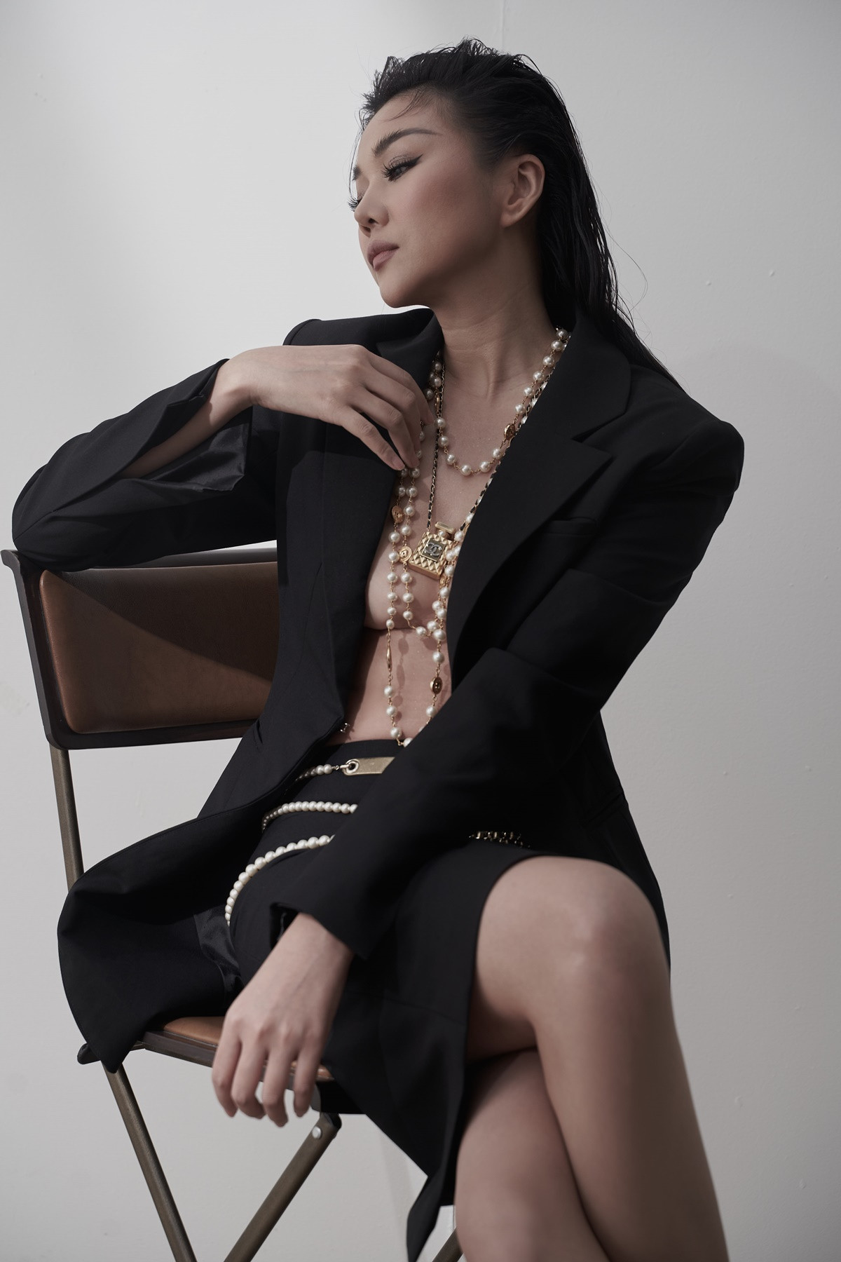 Thanh Hằng khoe vẻ đẹp sexy và táo bạo trong set đồ áo blazer không nội y kết hợp chân váy ôm, nhấn nhá vòng cổ nhiều tầng mang lại phong cách sang chảnh.