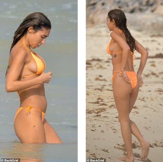 Chantel Jeffries mặc bikini hai mảnh bé xíu màu vàng cam, khoe body rám nắng gợi cảm.