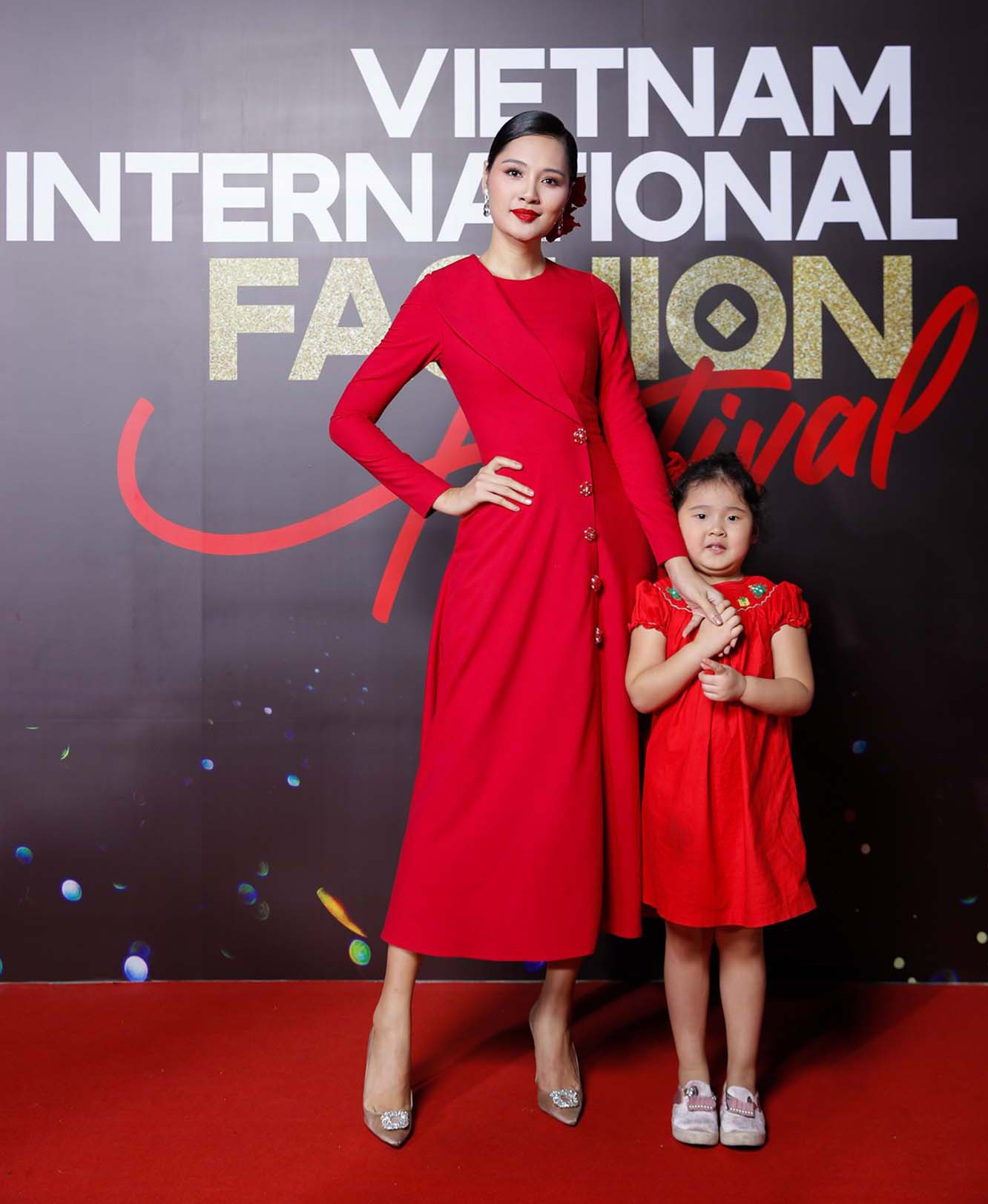 Hoa hậu Hương Giang cùng con gái diện trang phục tông đỏ đi xem thời trang.