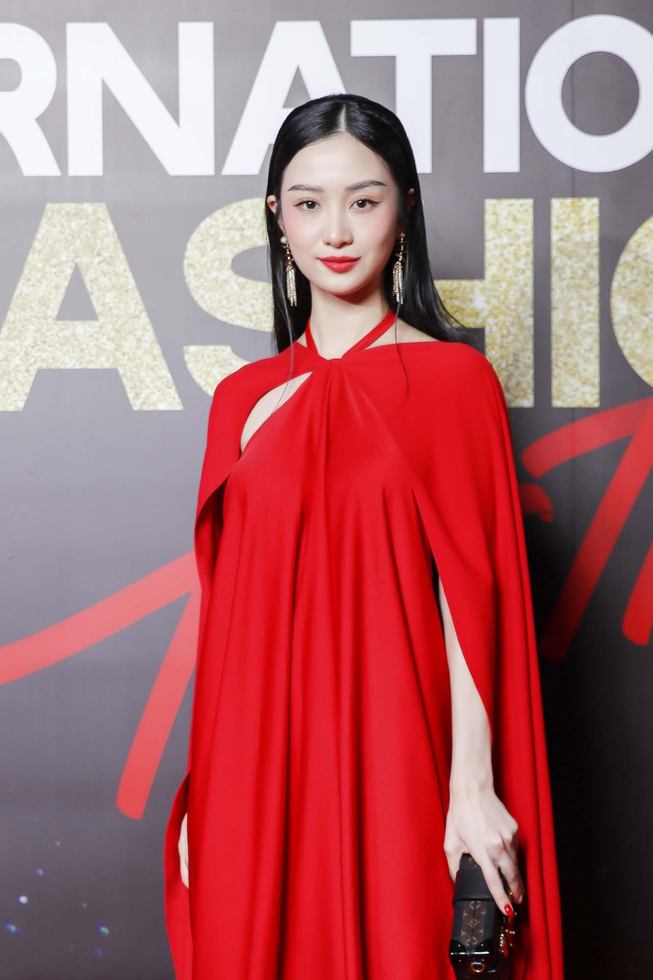 Diễn viên Jun Vũ cũng chọn tông đỏ rực rỡ khi đi xem thời trang vào đêm Noel.