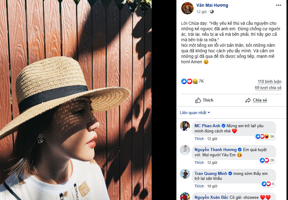 Cụ thể, Văn Mai Hương đăng tải một bức ảnh của chính mình và viết: "Hãy yêu kẻ thù và cầu nguyện cho những kẻ ngược đãi anh em. Ðừng chống cự người ác, trái lại, nếu bị ai vả má bên phải, thì hãy giơ cả má bên trái ra nữa."