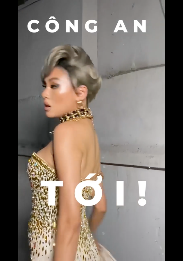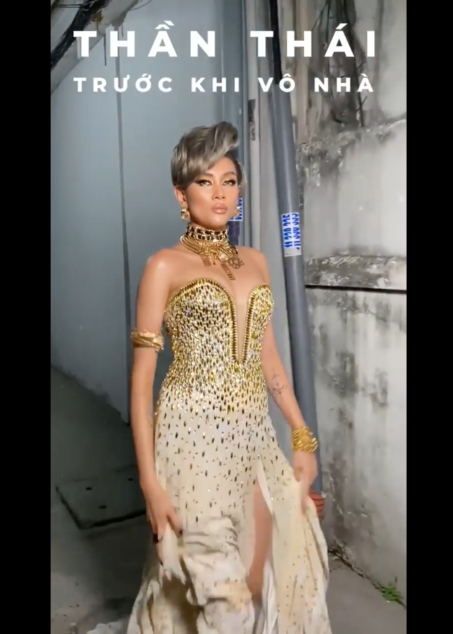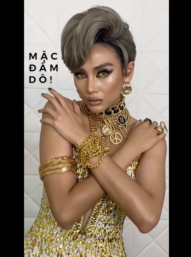 Sau khi đeo vàng đầy người, Võ Hoàng Yến 'lên đồ' váy dạ hội cũng được đính kết bằng những hạt cườm màu vàng lấp lánh chói mắt. Đặc biệt, có thể thấy bộ váy mà cô mặc trên người chính là chiếc đầm dạ hội Võ Hoàng Yến mặc trên sân khấu đêm chung kết Miss Universe năm nào.