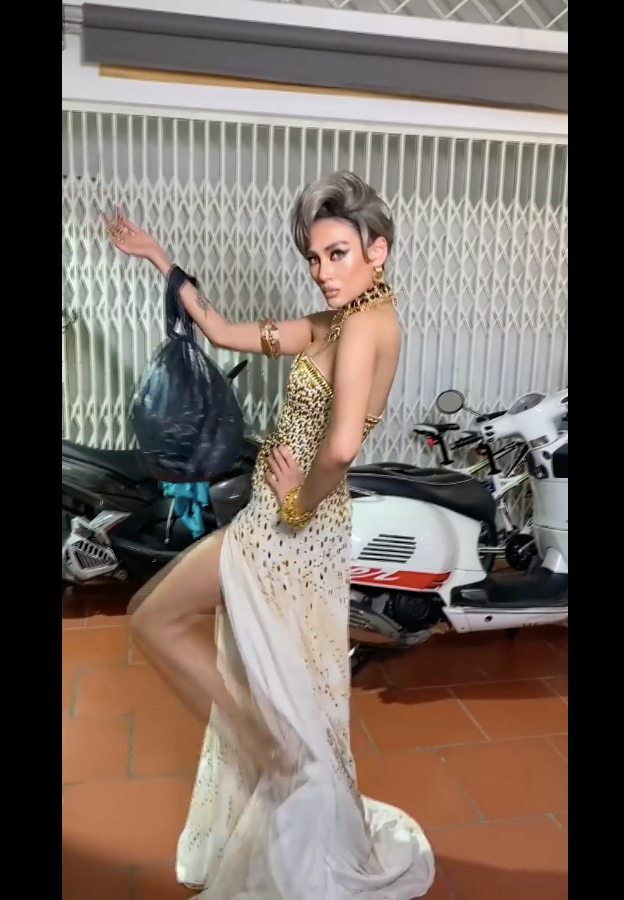 Với diện mạo lộng lẫy này, các fans cứ tưởng rằng Võ Hoàng Yến đang tham gia một buổi chụp hình thời trang hoặc đi dự sự kiện nào đó, nhưng hóa ra là người đẹp đang đi...đổ rác. Trên tay cô là túi rác màu đen rất to nhưng Võ Hoàng Yến vẫn tạo dáng rất thần thái.