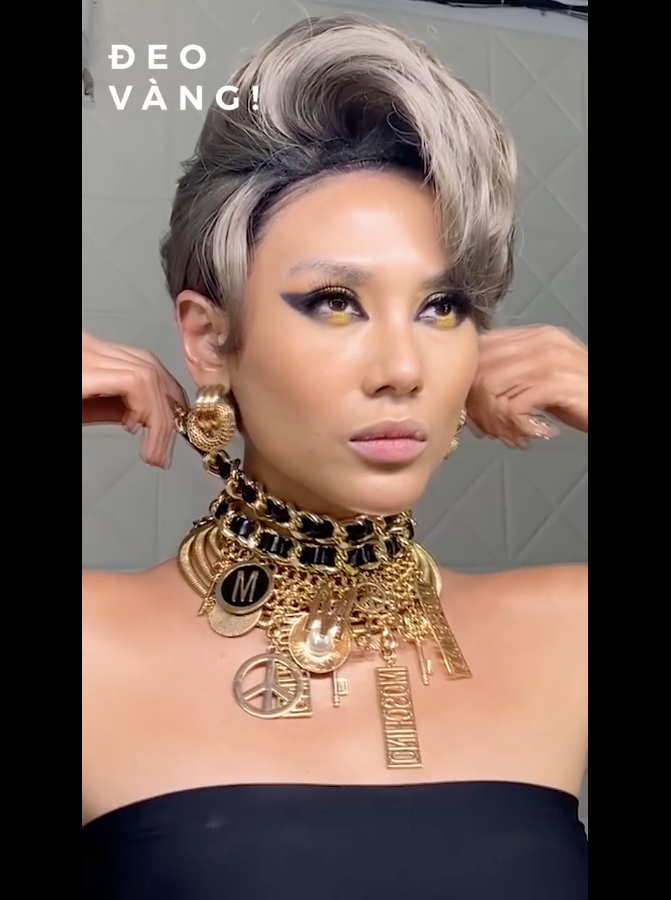 Cô còn sử dụng rất nhiều phụ kiện, đặc biệt là đeo rất nhiều vàng ở cổ.