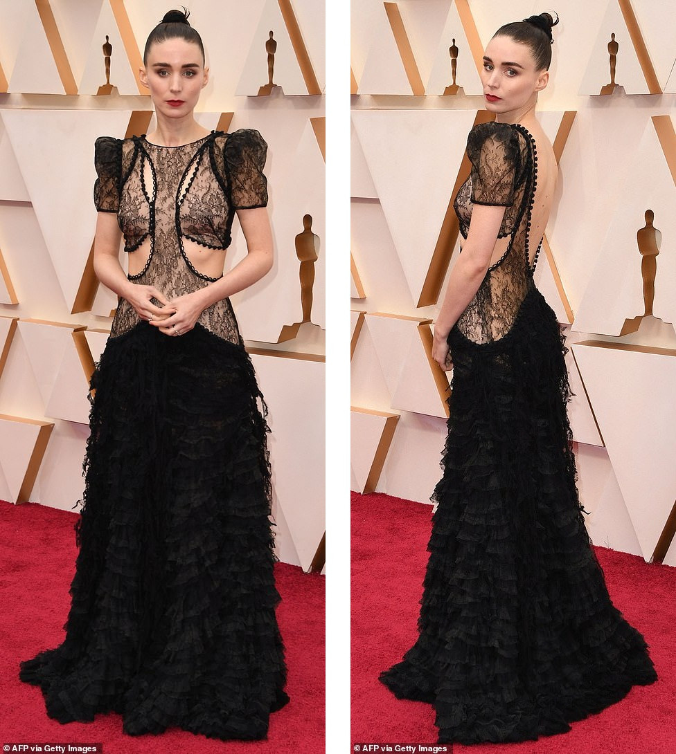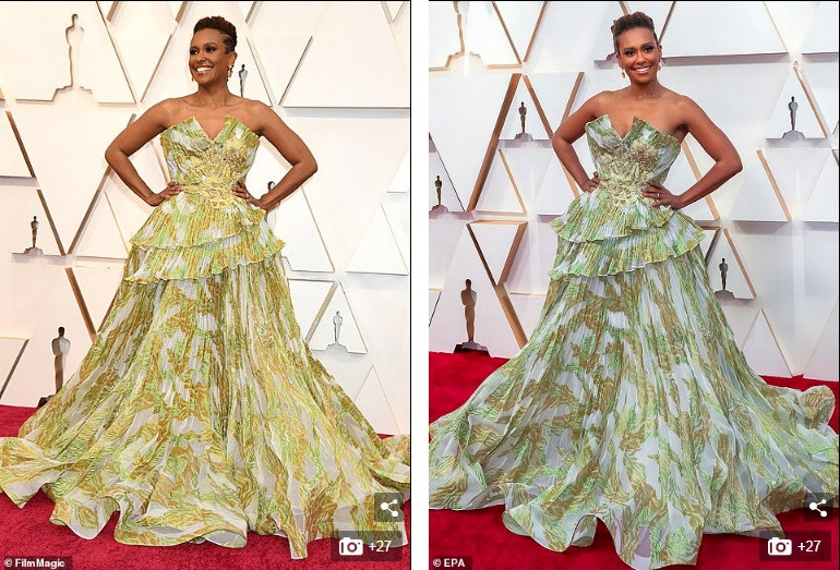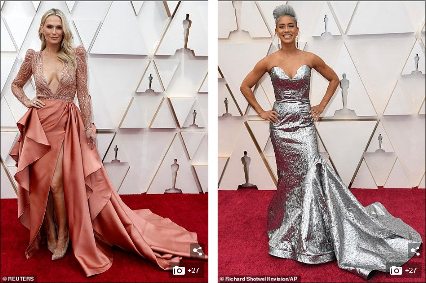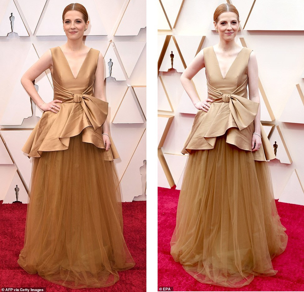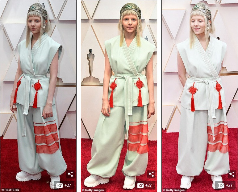 Cô đến sự kiện với chiếc váy "hở bạo" của Dona Matoshi và đi giày Jimmy Choo. Tuy nhiên, set đồ hàng hiệu không giúp cô thoát khỏi "thảm cảnh" bị liệt vào top 1 sao mặc xấu nhất thảm đỏ Oscar 2020.