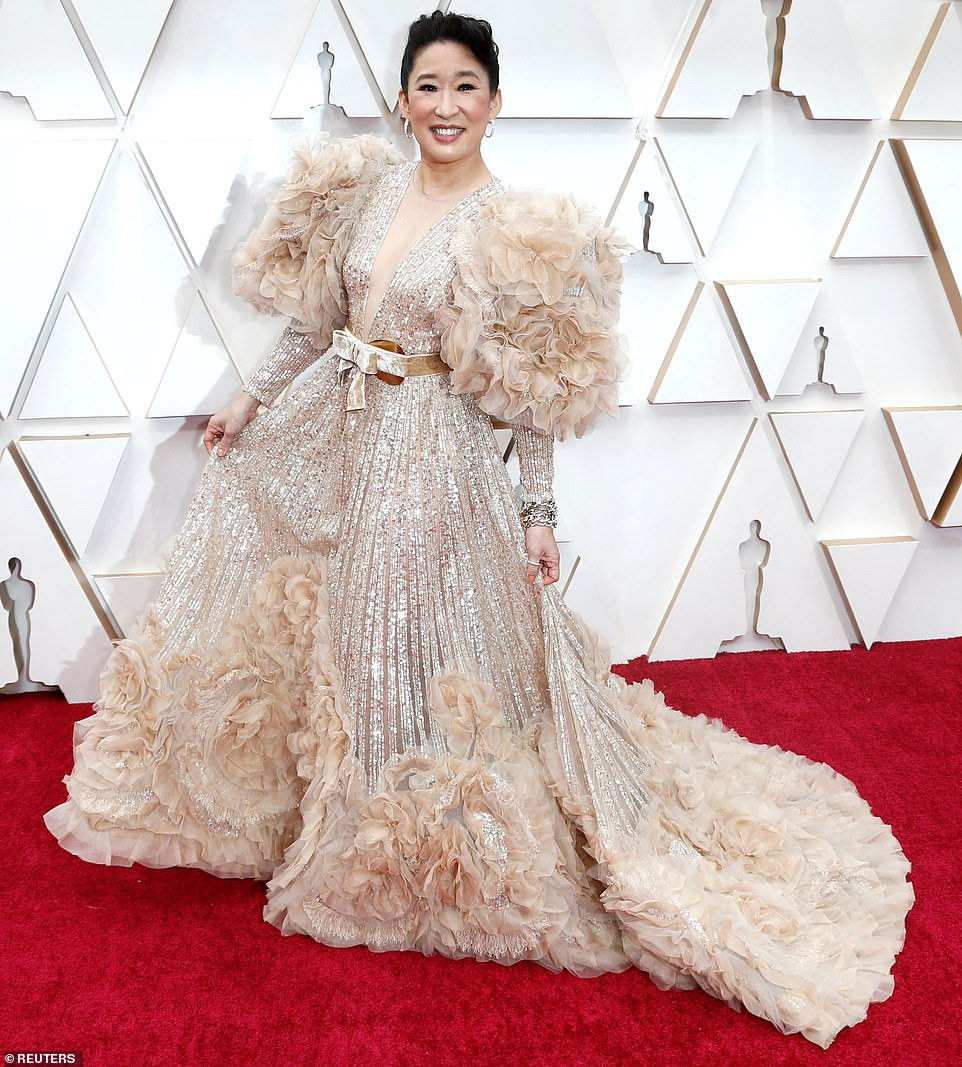 Sao gốc Hàn Sandra Oh chọn trang phục cầu kỳ cho sự kiện danh giá. Đáng tiếc, những chi tiết bèo ở chân váy và vai quá rườm rà, "dìm" người mặc.
