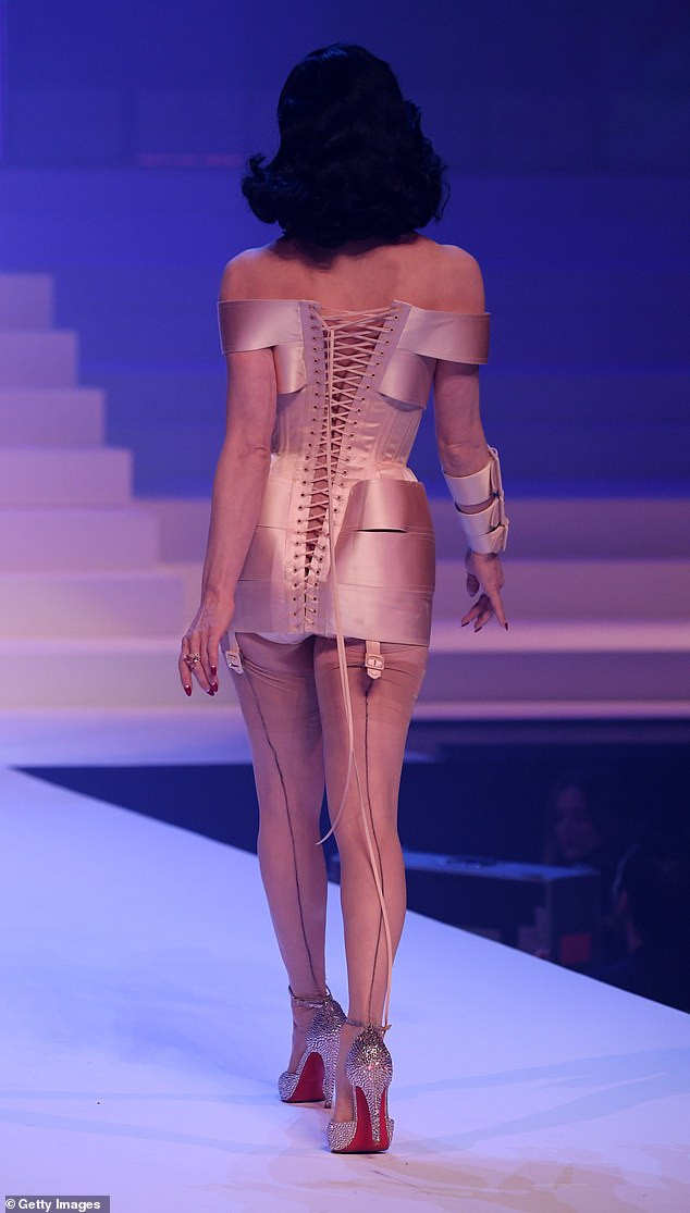 Dita Von Teese diện váy cuốn bằng 5 chiếc thắt lưng độc đáo lạ mắt trong show cuối cùng của nhà thiết kế lừng danh người Pháp Jean-Paul Gaultier trước khi ông nghỉ hưu ở tuổi 67.