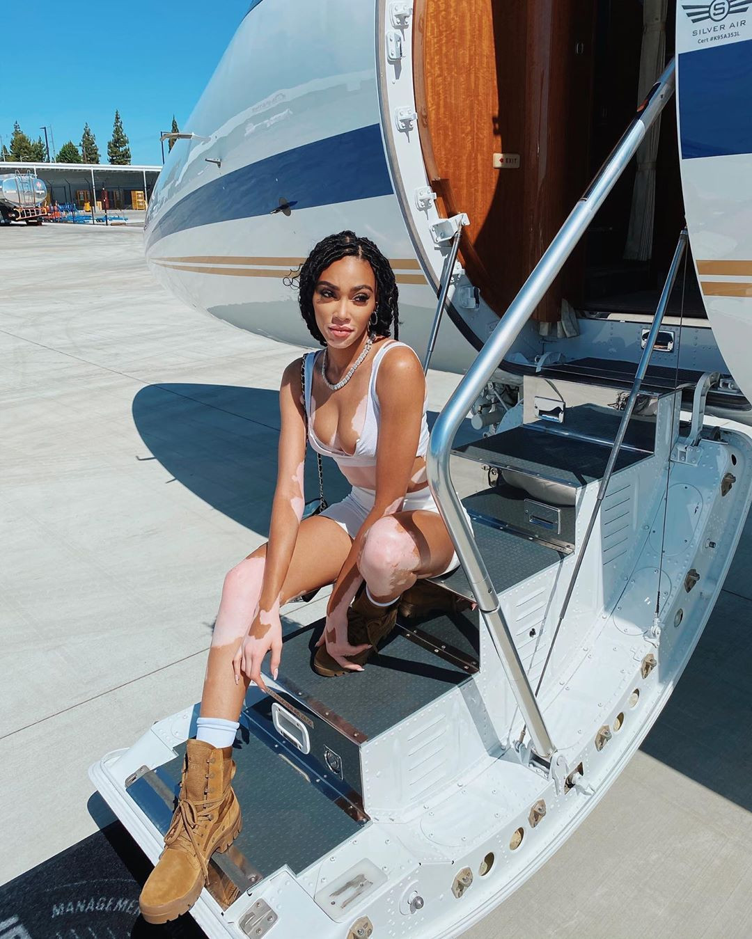 Là người mẫu nổi tiếng, cô gái da màu thường xuyên lên máy bay tới nhiều thành phố lớn vì công việc. Ảnh Winnie Harlow mặc trang phục kiệm vải chẳng khác nào bikini tôn ngực đầy hút triệu lượt "thả tim".