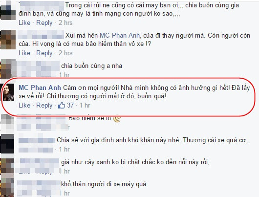 Khi nhận được nhiều lời động viên của mọi người, MC Phan Anh cũng không quên thông báo tình hình hiện tại để mọi người bớt lo lắng. Đồng thời, anh cũng bày tỏ sự tiếc thương khi có người qua đời do những cây đổ gần chỗ xe vợ anh đang đỗ: "Cám ơn mọi người! Nhà mình không có ảnh hưởng gì hết! Đã lấy xe về rồi! Chỉ thương có người mất ở đó, buồn quá!".