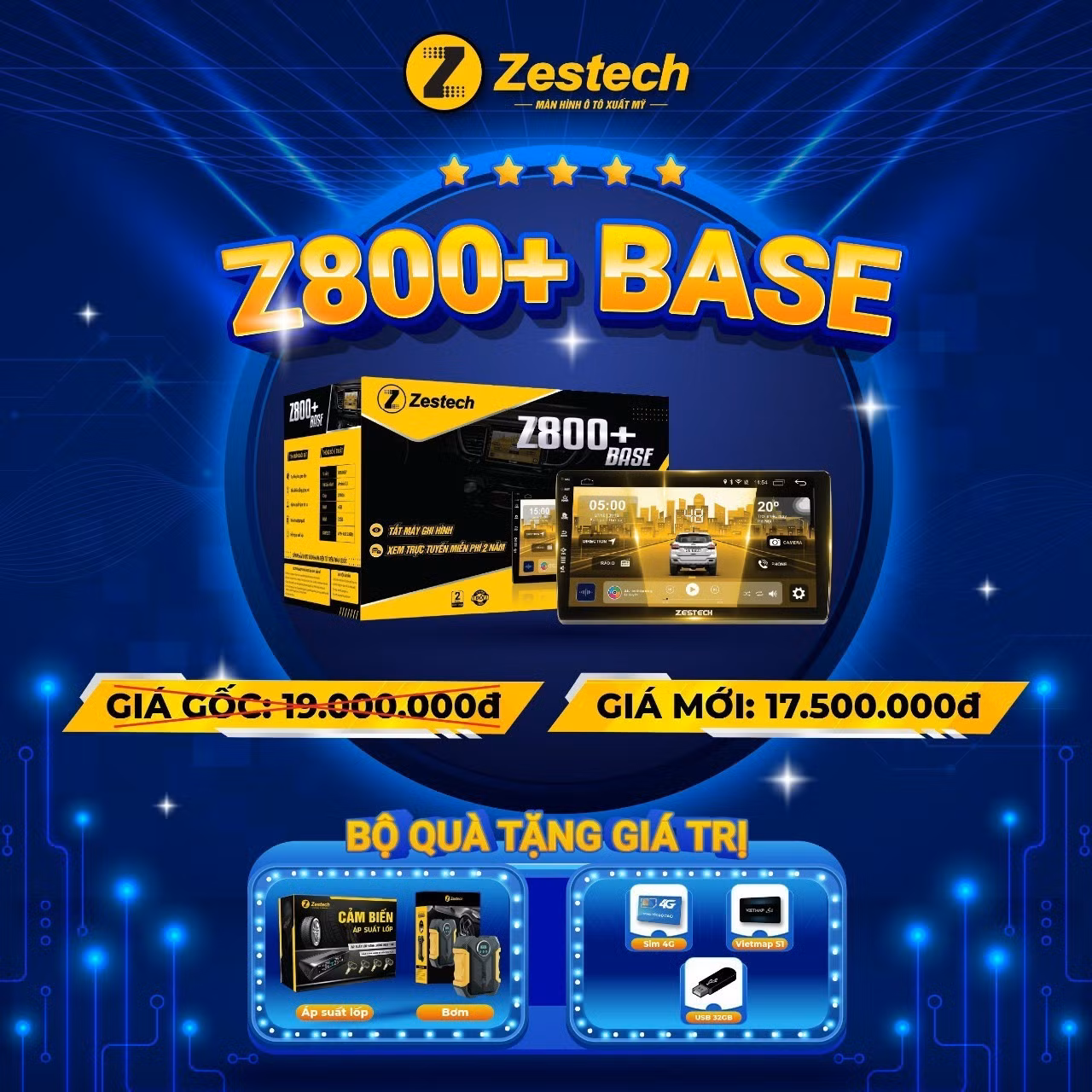 Tiếp tục gia hạn thời gian chương trình “MUA 1 ĐƯỢC 3 - THẢ GA QUÀ TẶNG”, khi mua Màn hình Zestech liền Camera 360, quý khách hàng sẽ được TẶNG NGAY 01 Cảm biến áp suất lốp + 01 Bơm lốp ô tô trị giá 4.500.000 VNĐ.