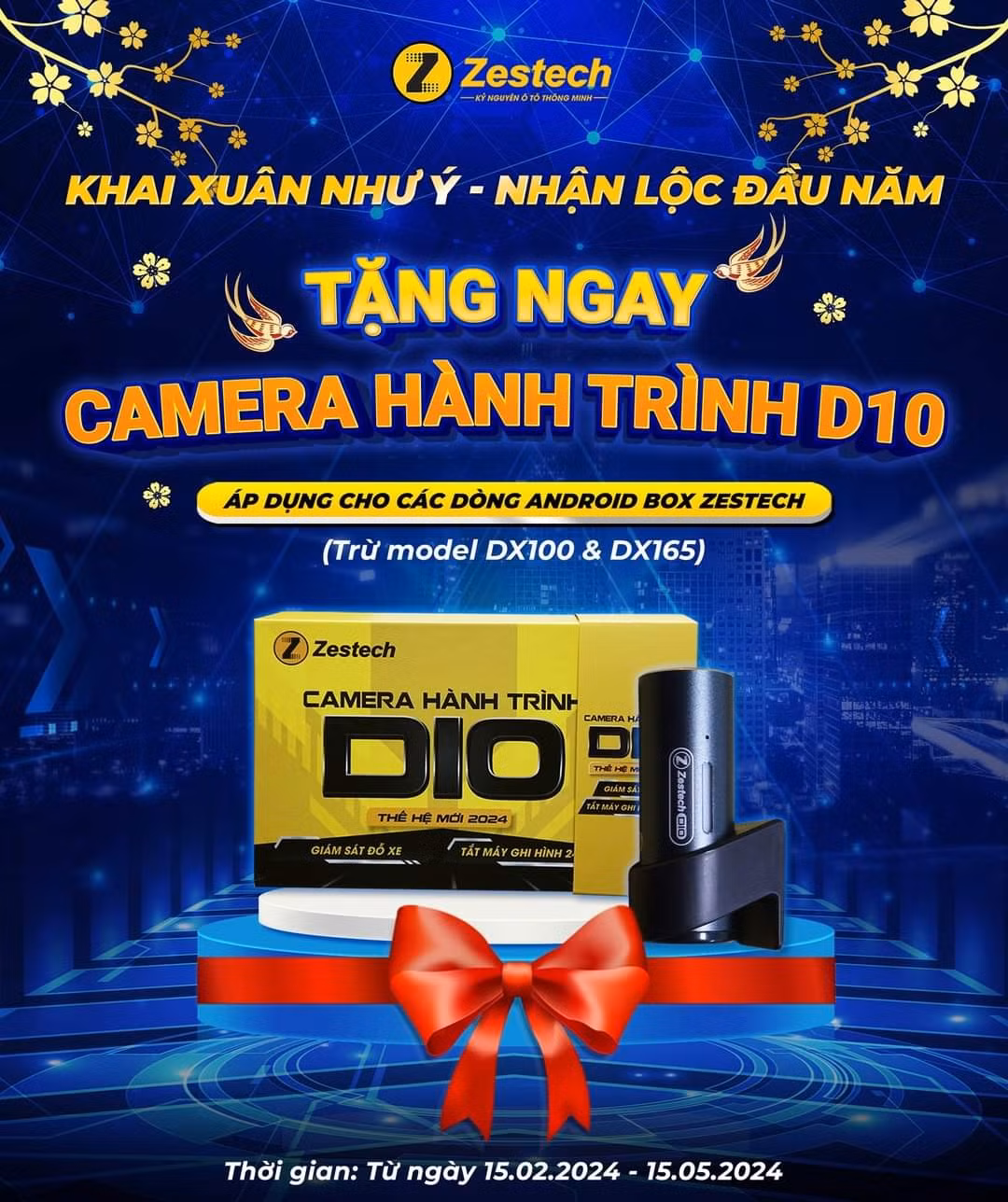 Chương trình bắt đầu: Từ ngày 15/02/2024 - 15/05/2024, khi quý khách mua các dòng sản phẩm Android Box Zestech (trừ model DX100 & DX165) sẽ được TẶNG CAMERA HÀNH TRÌNH D10.