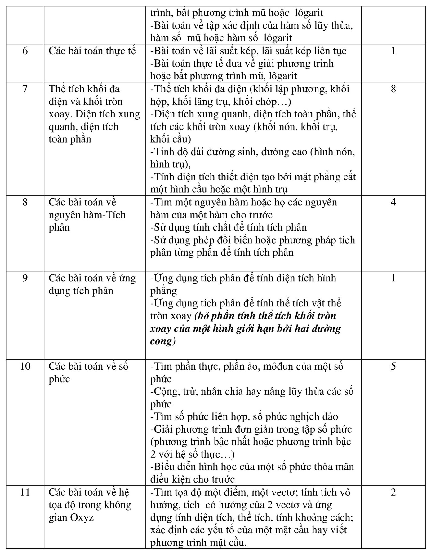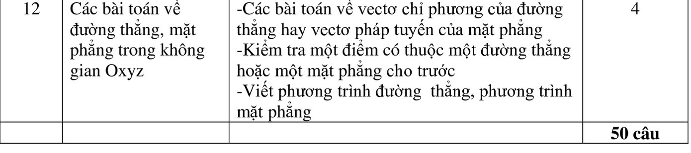 Ứng dụng của đạo hàm, khảo sát và vẽ đồ thị của hàm số; Hàm số lũy thừa, hàm số mũ và hàm số logarit; Nguyên hàm, tích phân và ứng dụng; Số phức; Khối đa diện - Thể tích khối đa diện; Mặt nón, mặt trụ, mặt cầu; Phương pháp tọa độ trong không gian (Tọa độ 1 điểm, tọa độ một vectơ, các phép toán giữa các vectơ và ứng dụng; phương trình mặt phẳng, phương trình đường thẳng và phương trình mặt cầu trong không gian Oxyz.