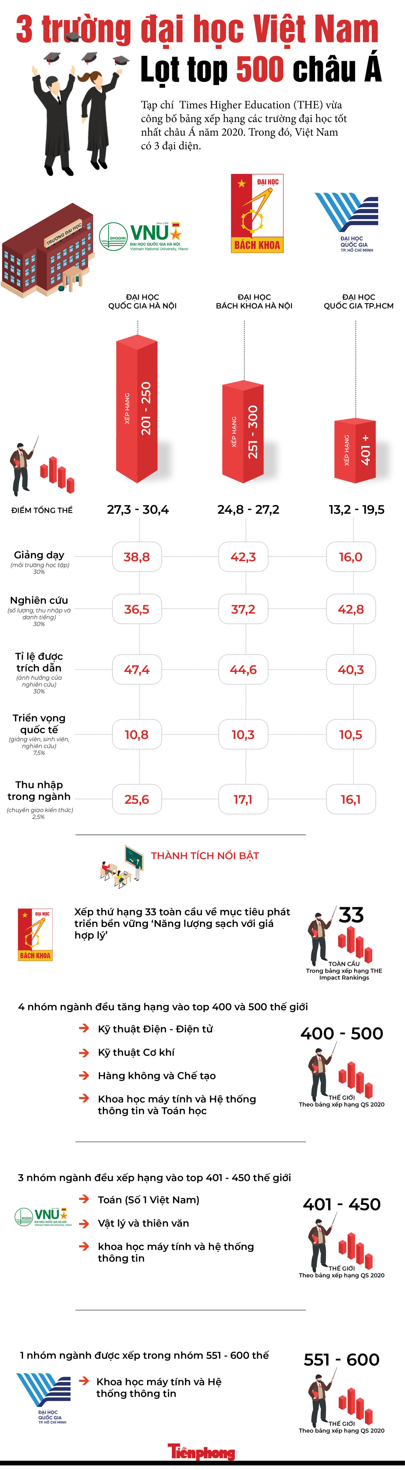 TPO - Tạp chí Times Higher Education (THE) vừa công bố bảng xếp hạng các trường đại học tốt nhất châu Á năm 2020. Việt Nam có 3 đại diện đó là 2 ĐH quốc gia và trường ĐH Bách khoa Hà Nội.