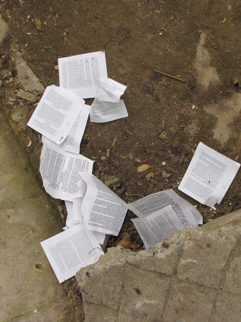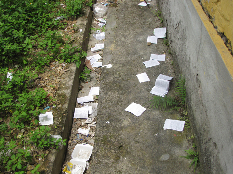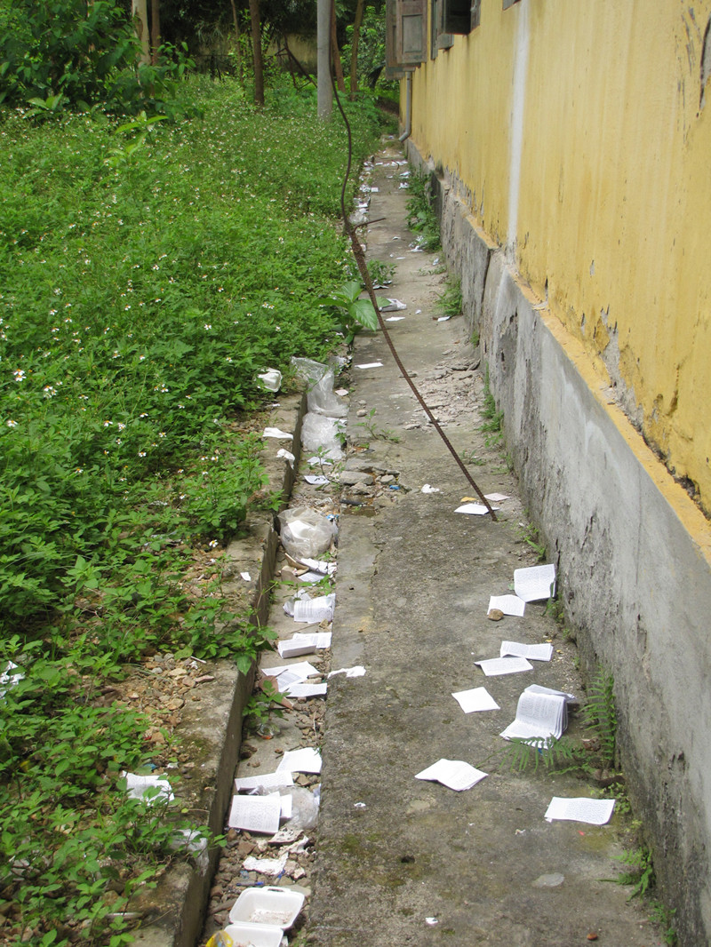 | Bên trong vườn nằm trong khu vực thi, dưới các cửa sổ phòng thi, phao thi vứt la liệt. Ảnh: Trường Phong. |