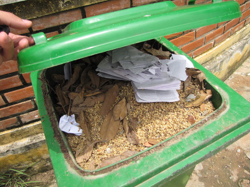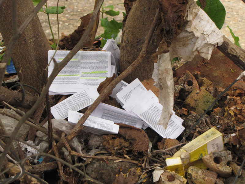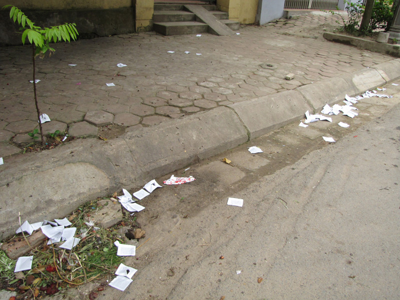 | Phao thi vứt bừa bãi trước cổng Hội đồng thi tại trường THPT Bến Tre. Ảnh: Trường Phong. |
