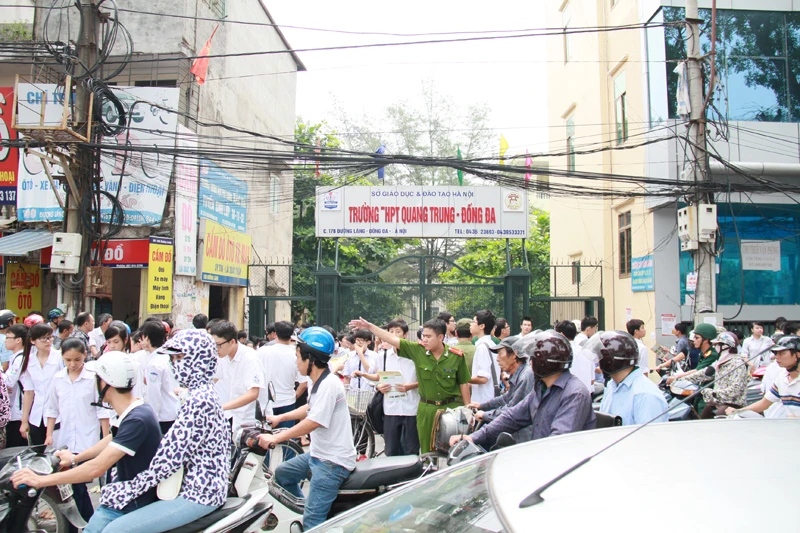 | Nhiều phụ huynh đứng chờ con trước cổng trường THPT Quang Trung (Hà Nội). Ảnh: Trường Phong. |