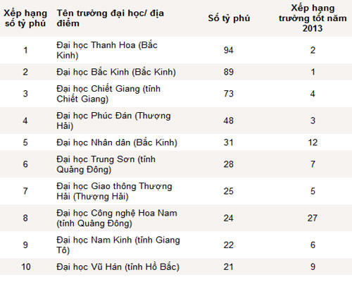 Trang China Daily dẫn báo cáo từ cổng thông tin trên cho biết, trong ba thập niên qua, có 183 sinh viên tốt nghiệp hai trường trên trở thành tỷ phú Trung Quốc. Trong đó, Đại học Thanh Hoa có 94 cựu sinh viên là tỷ phú, Đại học Bắc Kinh có 89 người.