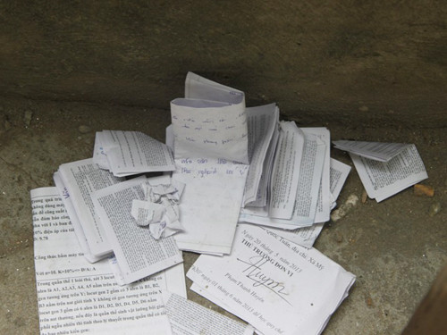 Kết thúc giờ làm bài thi đầu tiên môn Văn sáng nay (2/5), tại hội đồng thi trường THPT Trần Phú, TP Đà Nẵng xuất hiện rải rác phao thi dưới sân trường. Tất cả phao thi được gấp xếp cách nhỏ gọn, thành 6-8 nếp gấp, để lọt trong lòng bàn tay. Nội dung phao thi về kiến thức cơ bản môn Văn, các tác gia, tác phẩm, một số bài văn phân tích...
