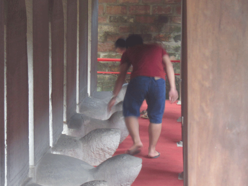 Nhiều sĩ tử cố vượt qua hàng rào, vào sờ đầu rùa, dù bảo vệ và các bạn sinh viên tình nguyện đứng ngoài liên tục nhắc nhở.