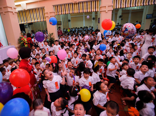 | Các em vui mừng đến trường trong ngày khai giảng. Ảnh: Như Ý |