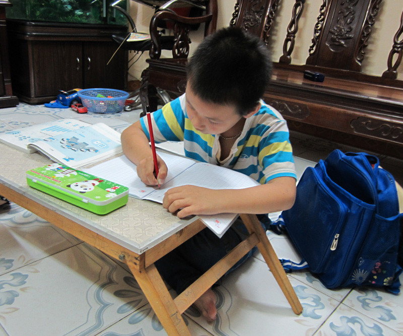 | Ở nhà, Hiếu tự giác mang vở ra tập viết. |