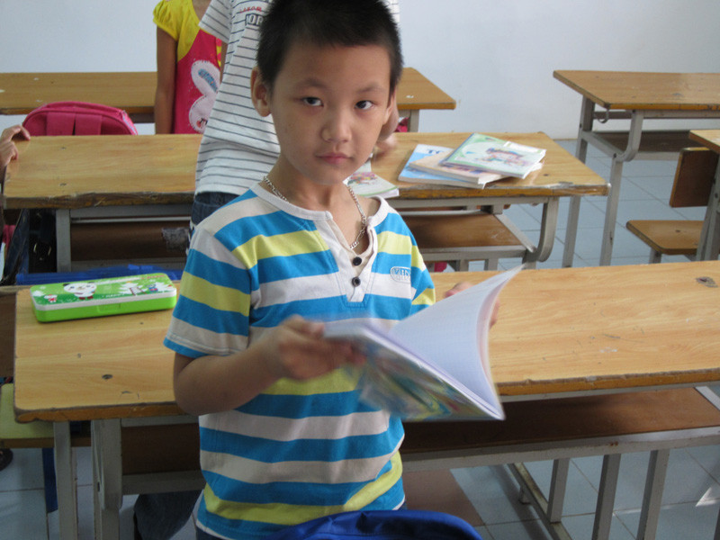 | Khi gặp người lạ, Hiếu tỏ ra rất bạo dạn, còn khoe vở viết của mình. |