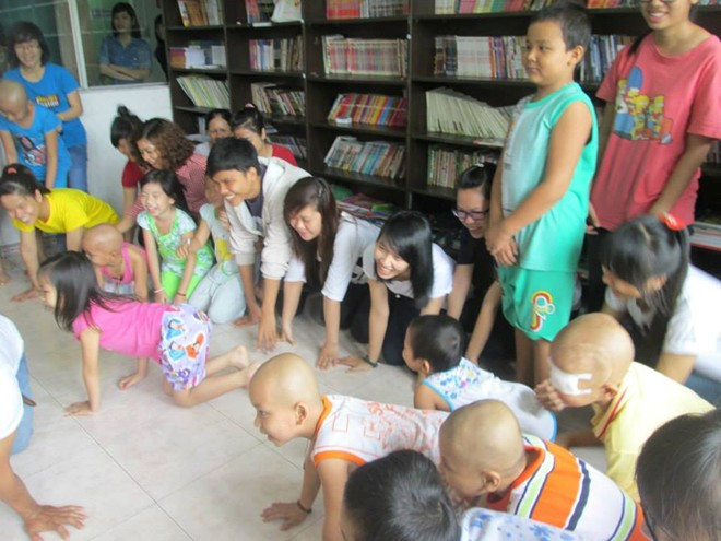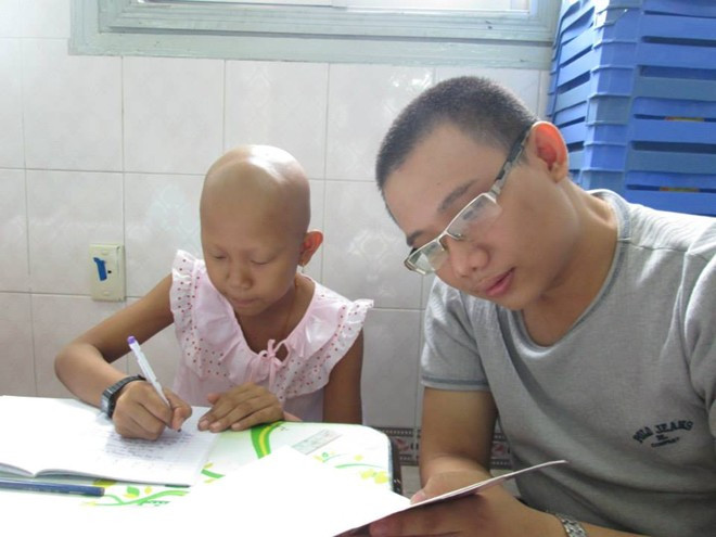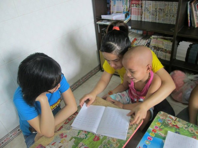 | Bé Yến Vy, 6 tuổi, được các anh chị tình nguyện dạy tập viết sau khi mới được trở về từ phòng ICU (phòng chăm sóc đặc biệt). |