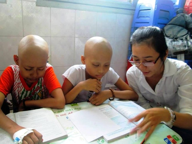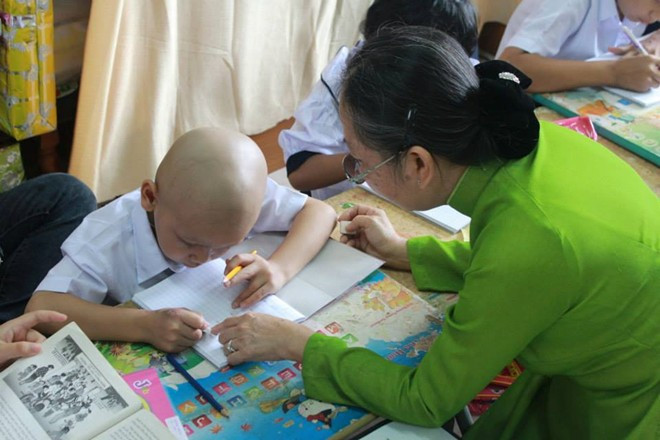 | Các em bé trọc đầu đang chống chọi với cơn đau để theo học chữ. |