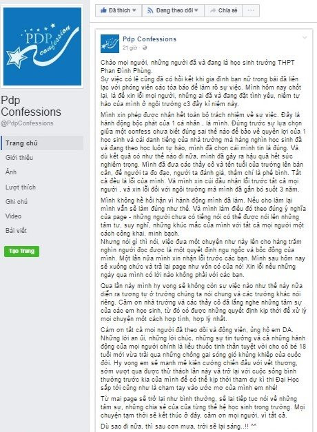 Nhưng nói gì thì nói, việc đưa một chuyện như này lên cho hàng trăm nghìn người đọc được là một quyết định ngu ngốc và bốc đồng của mình. Một lần nữa mình xin nhận lỗi trước các bạn. Mình sau hôm nay sẽ xuống chức và trả lại page như vốn có của nó! Xin lỗi nếu những ngày qua mình có lời nào không phải với các bạn.