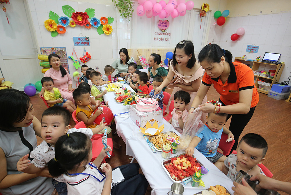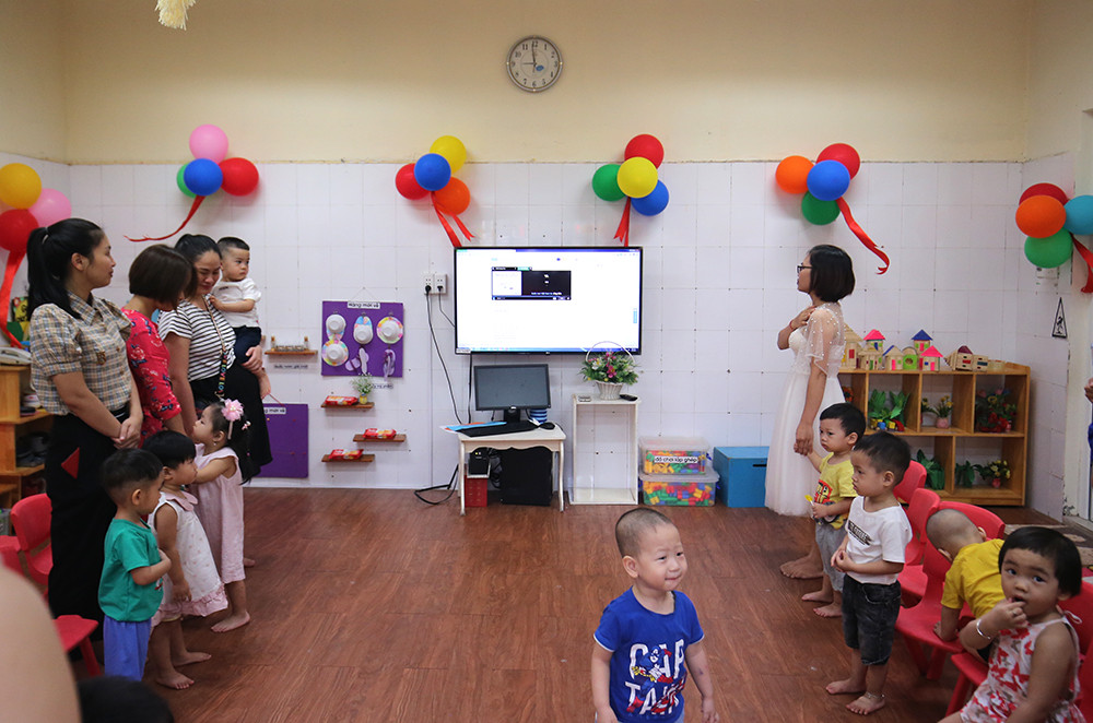 Tại trường mầm non Nhân Chính (Thanh Xuân, Hà Nội), lớp nhà trẻ được tập trung trong lớp và được cô giáo cùng phụ huynh học sinh đến dự lễ khai giảng