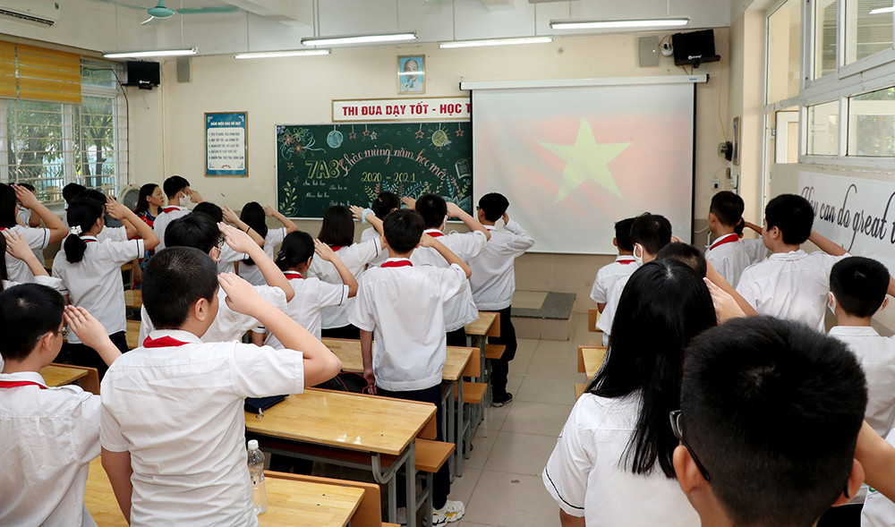 Các em học sinh khối 7-8 trường THCS Giảng Võ khai giảng trên lớp và ngoài sân trường xem trực tuyến