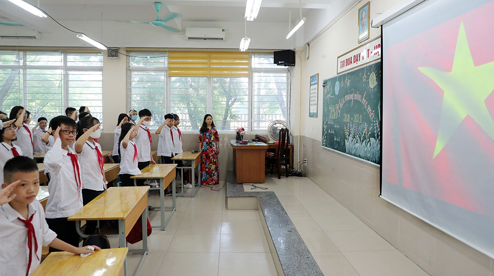 Các khối 2-3-4-5, mỗi lớp chỉ cử 10 -12 học sinh tập trung dưới sân trường để đảm bảo giãn cách. Những học sinh còn lại tập trung tại lớp theo dõi lễ khai giảng được truyền trực tiếp tới màn hình. Lễ khai giảng diễn ra nhanh gọn trong 30 phút đúng như quy định.
