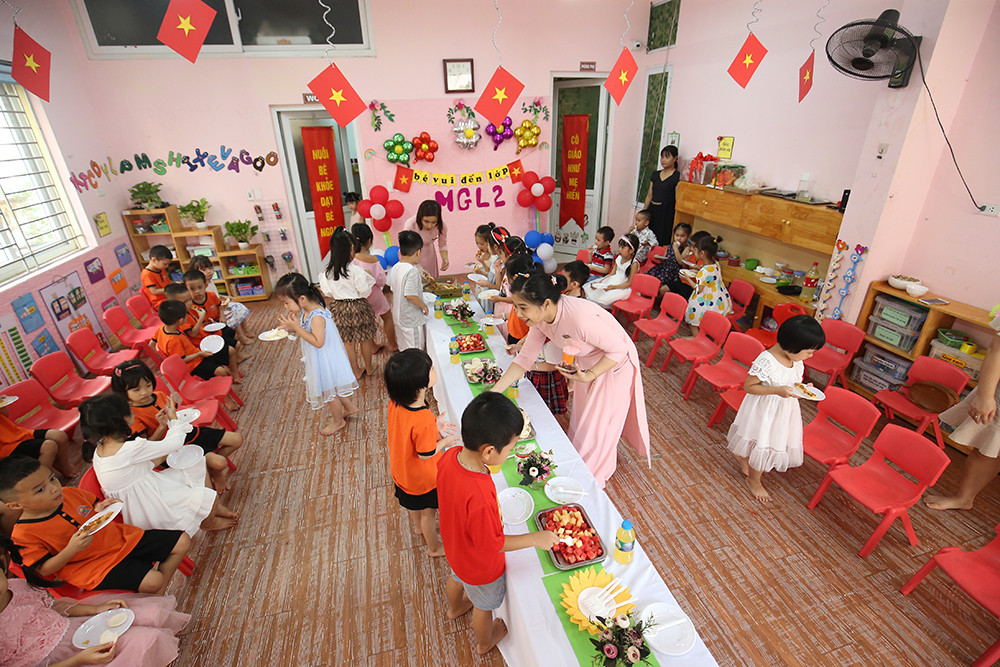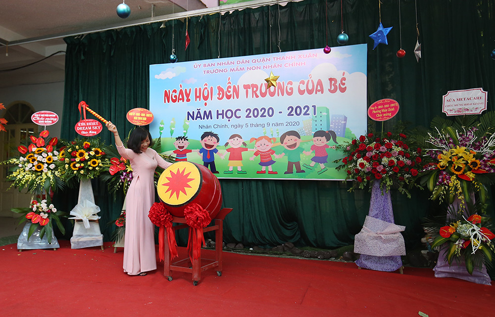 Hiệu trưởng trường mầm non Nhân Chính, Nguyễn Thị Bình đánh trống khai giảng năm học mới mà không có các em nhỏ đứng dự khai giảng thay vì đứng ngoài sân thì các em nhỏ dự khai giảng trong lớp học.