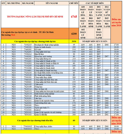 Điều kiện xét tuyển là tổng điểm của 3 môn lập thành tổ hợp xét tuyển, chưa nhân hệ số môn chính (đối với ngành Ngôn ngữ Anh) và đã bao gồm điểm ưu tiên (nếu có) dao động từ 16 đến 19 điểm tùy từng ngành tại cơ sở chính TPHCM. Ngành cao điểm nhất của trường là Thú y và Công nghệ kỹ thuật ô tô có ngưỡng đảm bảo chất lượng là 19 điểm.