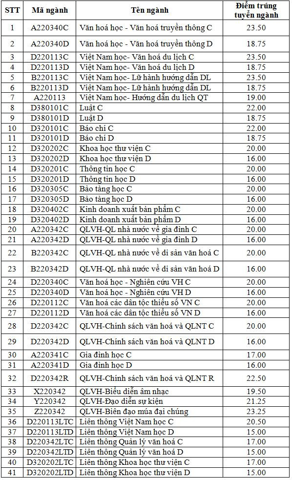 ĐH Văn hóa Hà Nội cũng vừa công bố điểm chuẩn vào trường. Theo đó, điểm các ngành dao động từ 15- 23,5 điểm.