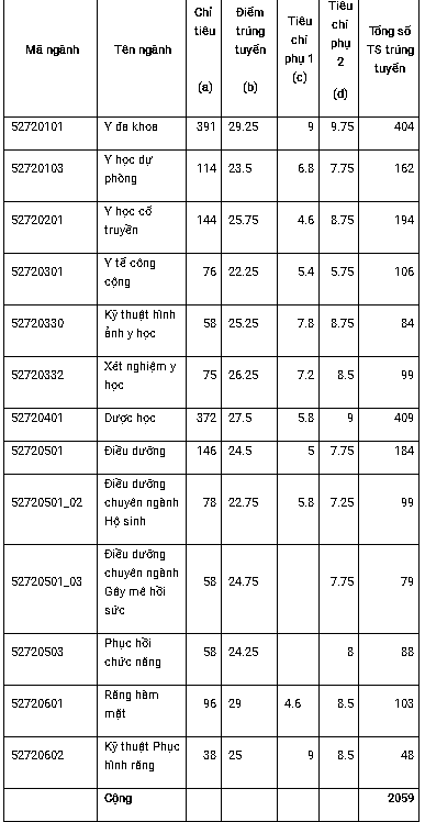 Theo đó, ngành  Y đa khoa có điểm chuẩn trúng tuyển lên đến 29,25 điểm, tiếp đó là ngành Răng hàm mặt với 29 điểm. Điểm trúng tuyển thấp nhất thuộc về ngành Y tế công cộng với mức 22,25 điểm.