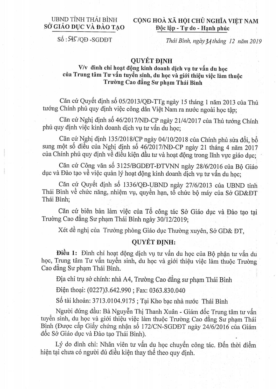 Chiều 8/1, lãnh đạo Sở GD-ĐT Thái Bình cho biết sở này vừa ban hành quyết định đình chỉ hoạt động kinh doanh dịch vụ tư vấn du học của Trung tâm Tư vấn tuyển sinh, du học và giới thiệu việc làm, thuộc Trường CĐ Sư phạm Thái Bình.