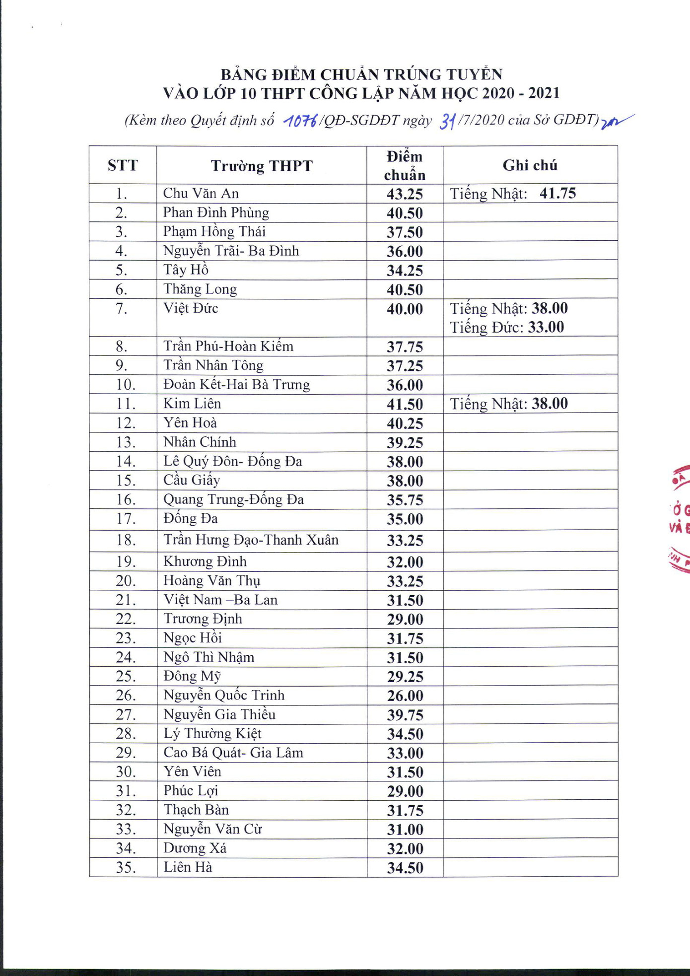 Theo đó, Trường THPT Chu Văn An năm nay có mức điểm chuẩn cao nhất là 43,25 điểm; Trường THPT Kim Liên: 41,5; THPT Yên Hòa: 40,25; THPT Nhan Chính: 39,25; Trường THPT Phan Đình Phùng có mức điểm chuẩn là: 40,5; THPT Thăng Long: 40,5; THPT Việt Đức: 40.0…