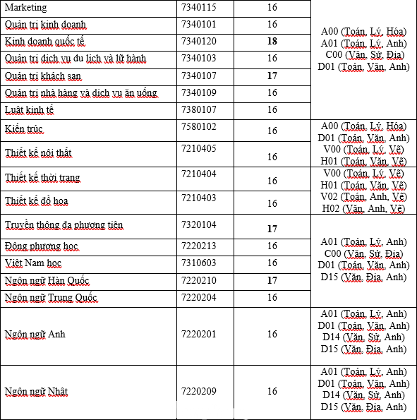 Mức điểm tối thiểu là 19 điểm dành cho các ngành gồm: Ngành Kinh tế, Ngành Quản trị kinh doanh, Ngành Kinh doanh quốc tế, Ngành Kinh doanh thương mại, Ngành Marketing, Ngành Tài chính - Ngân hàng, Ngành Kế toán, Ngành Quản trị dịch vụ du lịch và lữ hành, Ngành Quản trị khách sạn, Ngành Ngôn ngữ Anh, Ngành Luật.