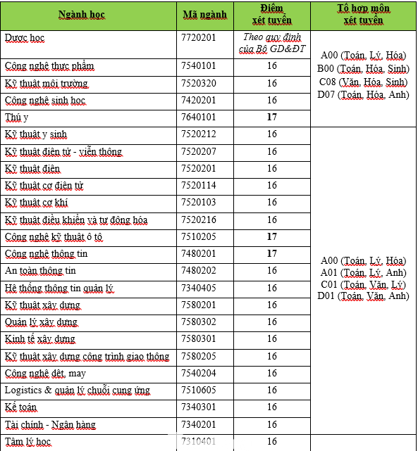 Mức điểm xét tuyển cụ thể cho 42 ngành đào tạo trình độ Đại học của HUTECH như sau: