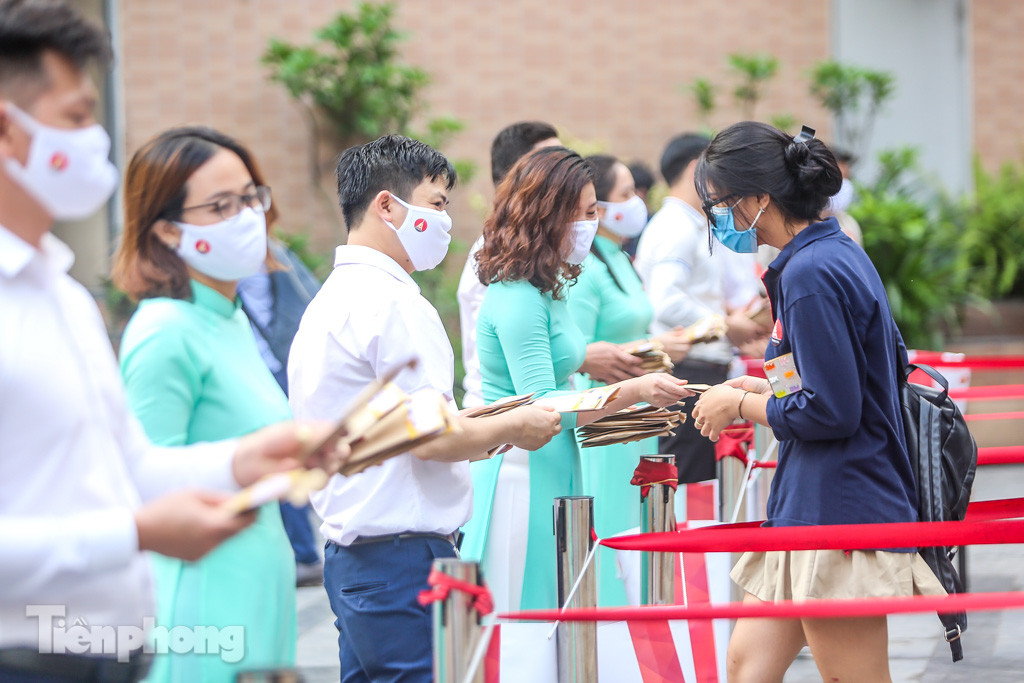 Học sinh bất ngờ nhận món quà ngay từ cổng sau khi rửa tay sát khuẩn, đo thân nhiệt.