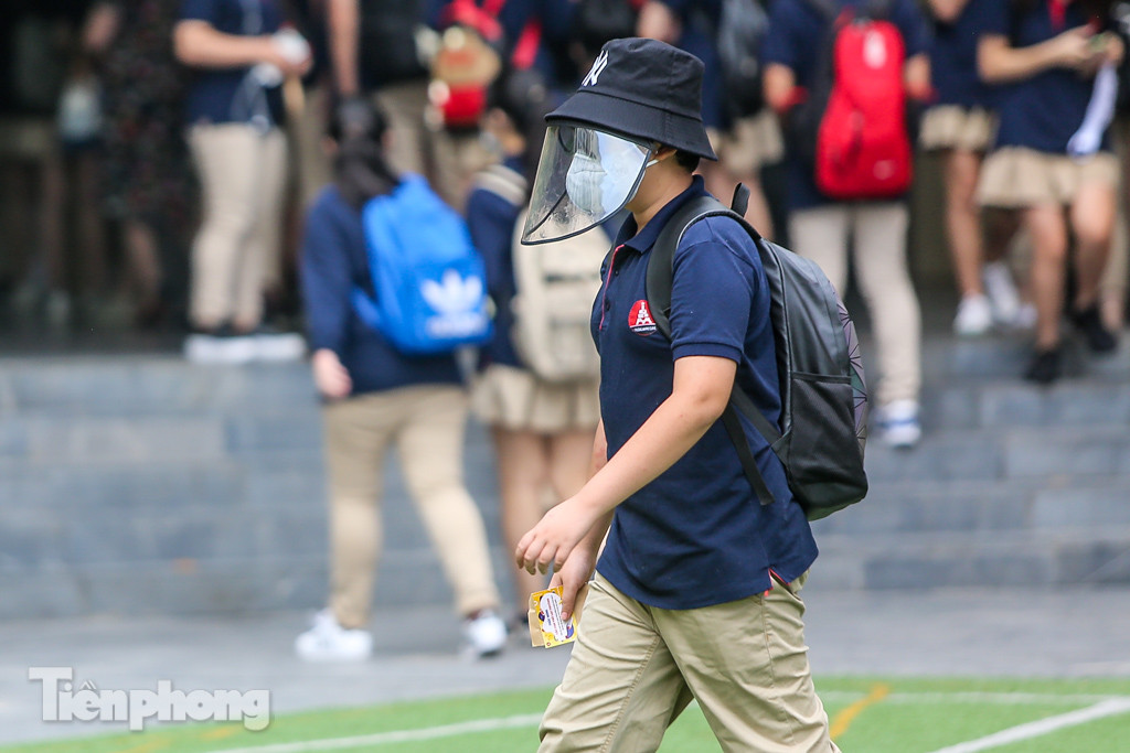 Nhiều học sinh trang bị mũ có tấm kính chắn để phòng COVID-19.