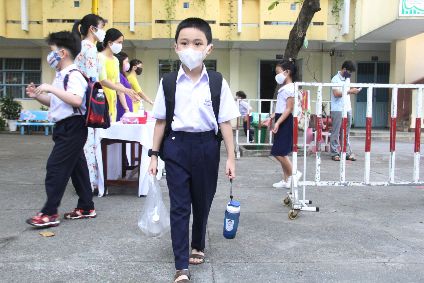Các em học sinh tiểu học được cha mẹ chuẩn bị nước uống, bình sát khuẩn đầy đủ trong ngày đầu đi học lại. Ảnh: Thanh Trần.