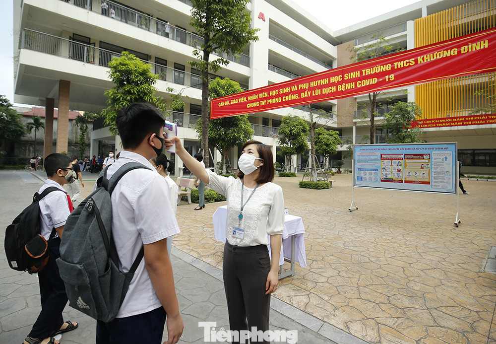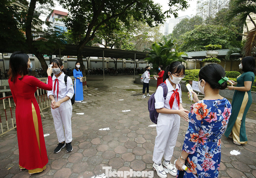 Tại trường THCS Nguyễn Trãi, quận Thanh Xuân, Hà Nội trước khi vào trường cũng được các cô giáo đo thân nhiệt và rửa tay khử khuẩn