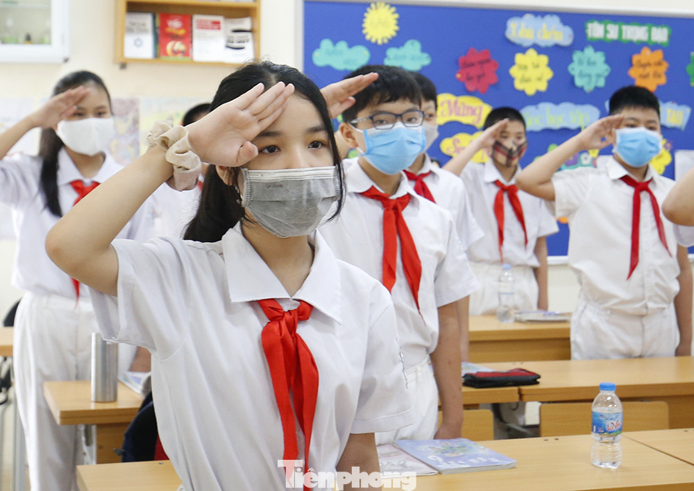 Các em thực hiện nghi thức chào cờ trong lớp học