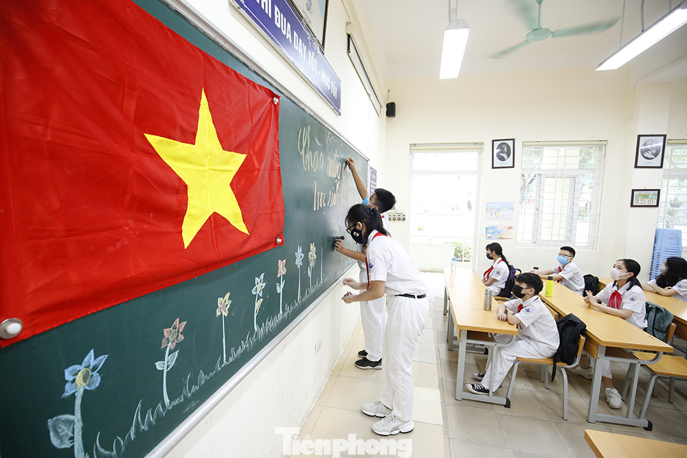 Tại mỗi lớp học của trường Nguyễn Trãi đều được gắn lá cờ đỏ sao vàng lên bảng