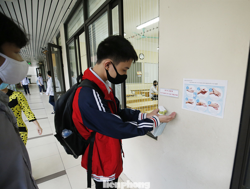Trước khi vào lớp các em học sinh được nhà trường bố trí gel rửa tay khô khử khuẩn
