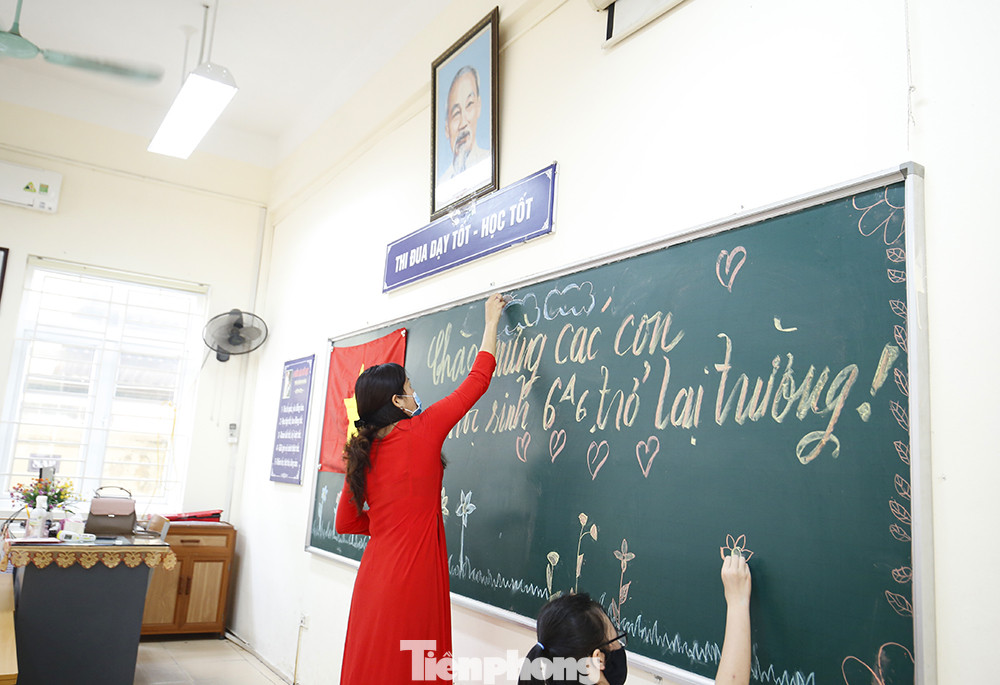 Bên trong lớp học các em chuẩn bị trang trí và vẽ dòng chữ "chào mừng các con học sinh 6A6 trở lại trường"