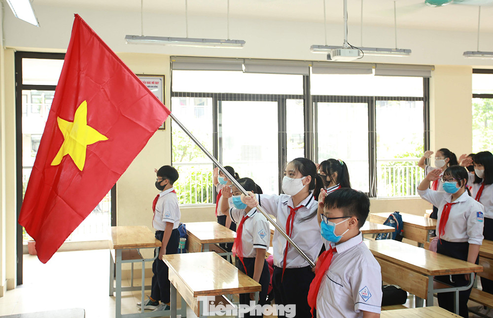 Gắn cờ sao vàng lên bảng để chào cờ, một nghi thức rất thiêng liêng