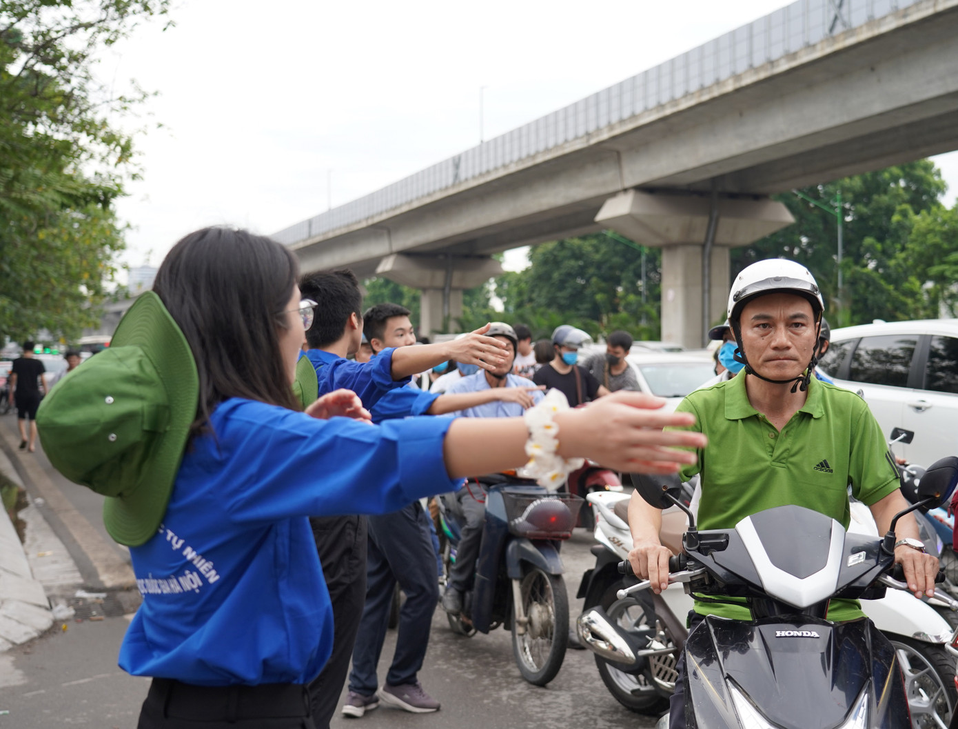 Từ 6h30, cổng trường ĐH Khoa học Tự nhiên, Đại học Quốc gia Hà Nội đã rất đông phụ huynh và thí sinh. Đội sinh viên tình nguyện của trường có mặt từ sớm và tạo thành hàng phân luồng giao thông từ cổng trưởng cho đến ngã ba Nguyễn Tuân – Nguyễn Trãi.